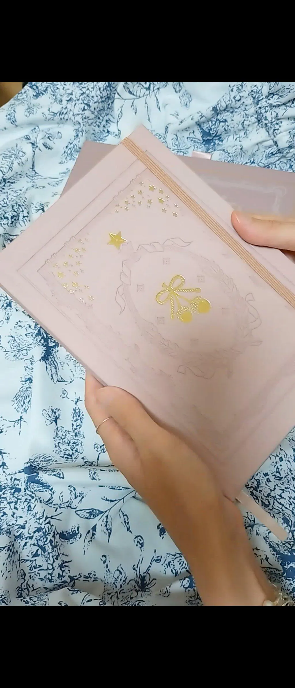The design of this notebook weaves together several symbolic elements: a pair of acorns tied with a bow, an oval frame wrapped with ribbons and oak leaves, twinkling stars, and flower buds climbing upward and gradually blooming.